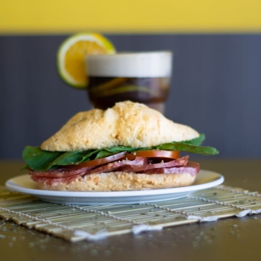 Pão de queijo recheado com salame, tomate, rucula e oregano.