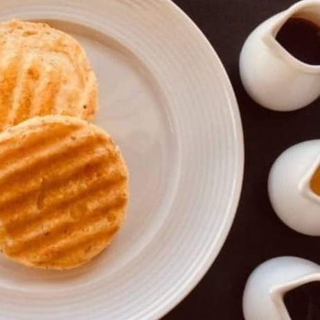 Waffle Feito Com Massa De Pão De Queijo Pancremo, Coberto Com Cream Cheese Gratinado E Orégano.
