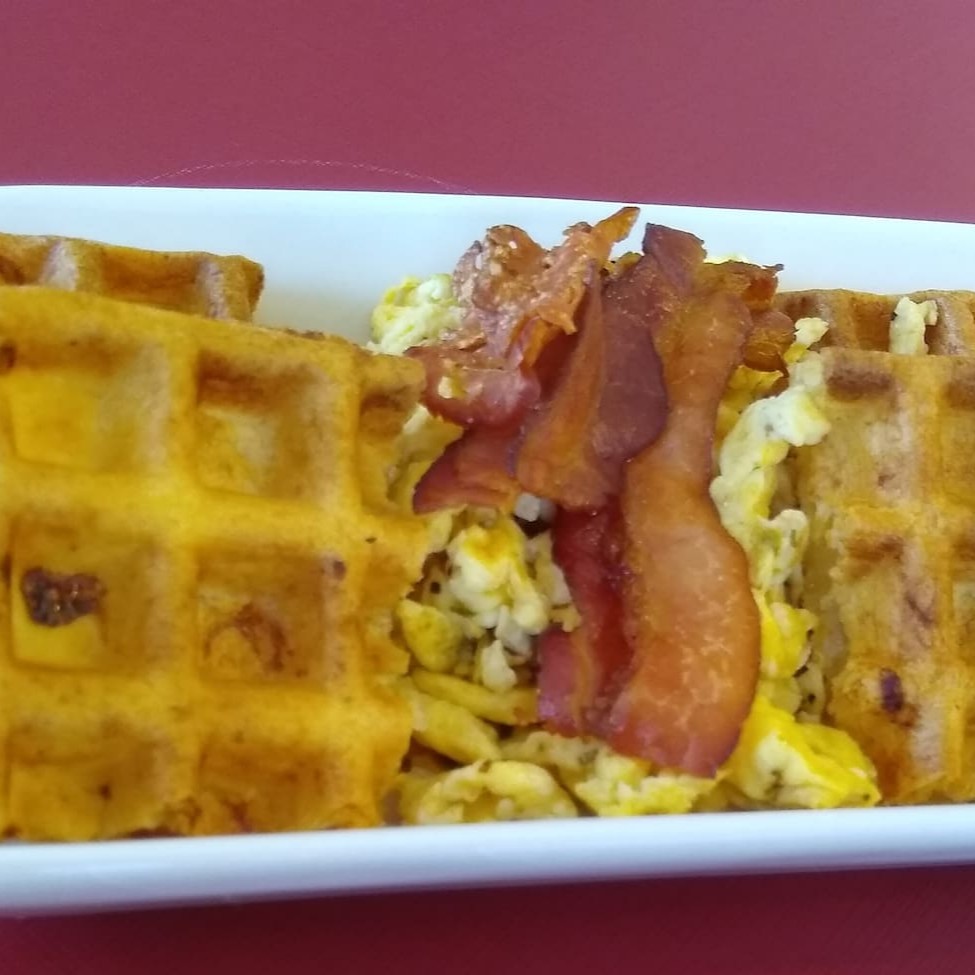Três ovos mexido, tiras de bacon e waffles de massa de pão de queijo.
