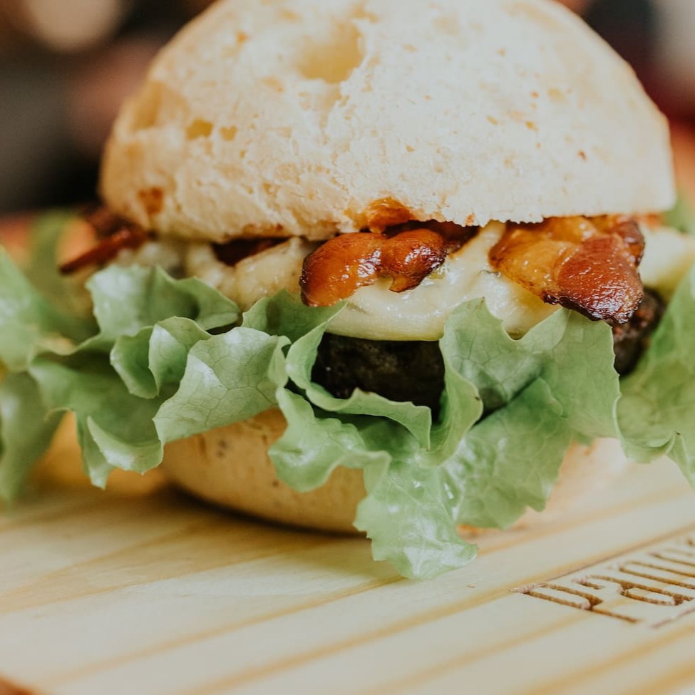Hamburguer de costela angus de 120gr, creme de requeijão de alho poró, alface, tomate e bacon, tudo no pão de queijo tradicional de 90 gramas Pancremo.
