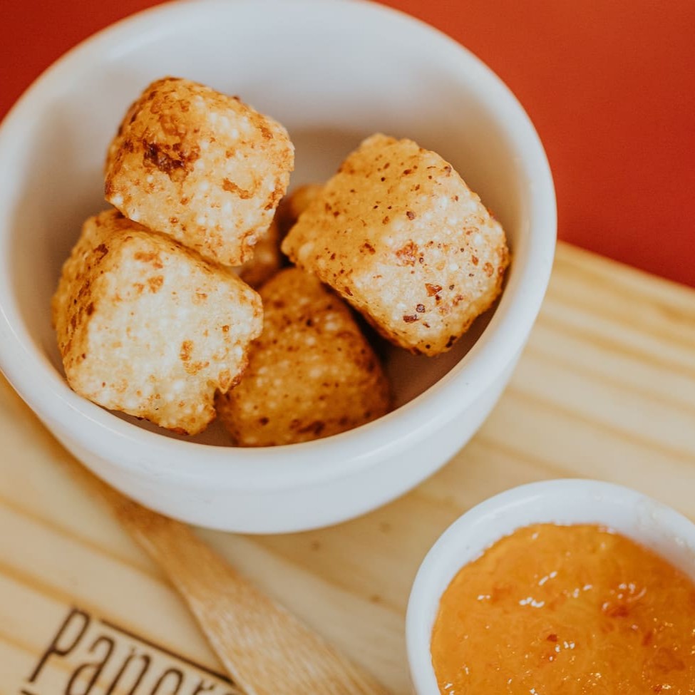 Dadinho de tapioca Pancremo foi desenvolvido com queijo coalho e um toque de Pimenta do reino branca. São 6 unidades frito no oleo, acompanha geleia de pimenta.