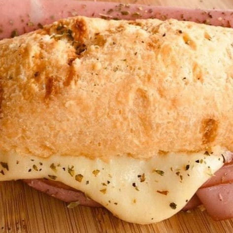Pão de queijo recheado com presunto, queijo mussarela, tomate e oregano.
