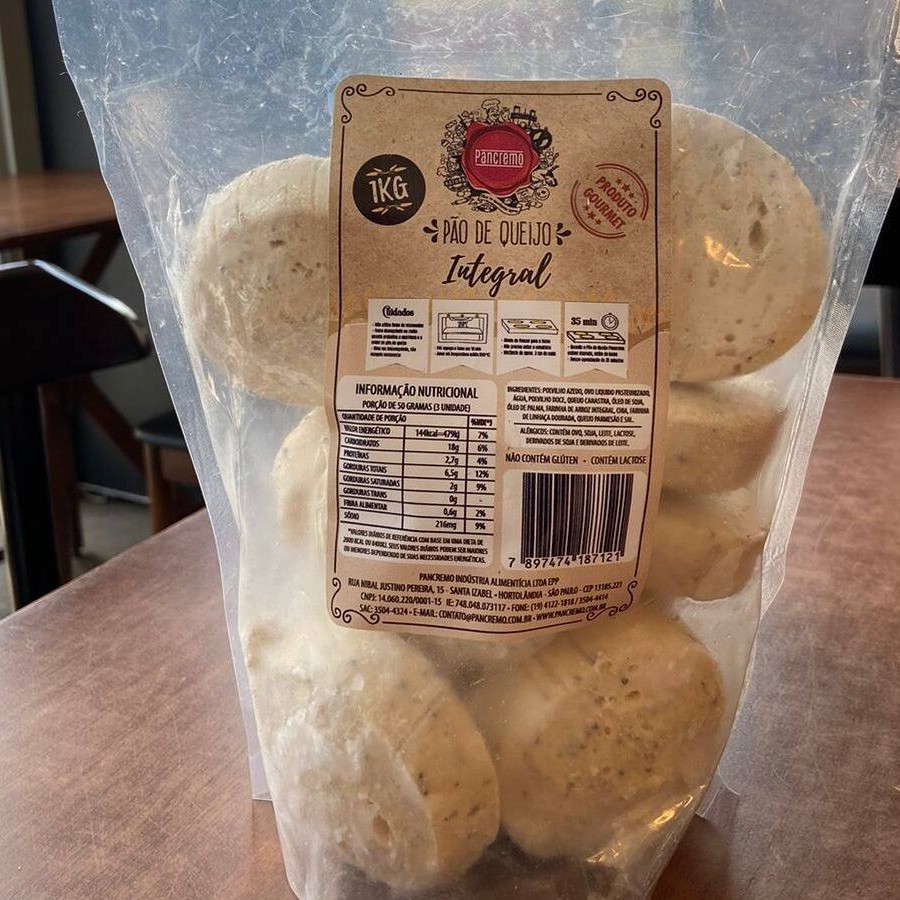 Rico em fibras, proteínas, nutrientes, minerais, vitaminas, ômega 3, cálcio e zinco. O Pão de Queijo Integral Pancremo é uma ótima opção para quem procura uma vida mais saudável. Contém chia, gergelim, linhaça dourada e farinha de arroz. Tudo isso sem perder o delicioso sabor de queijo Unidade de pão de queijo integral de 90 gramas assado. Sem glutem!