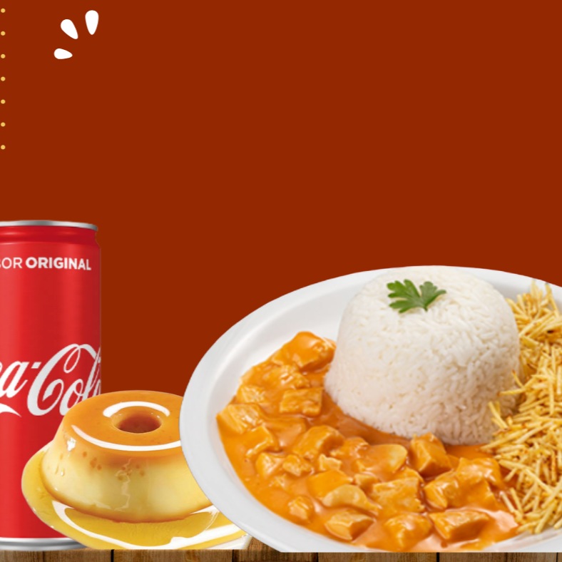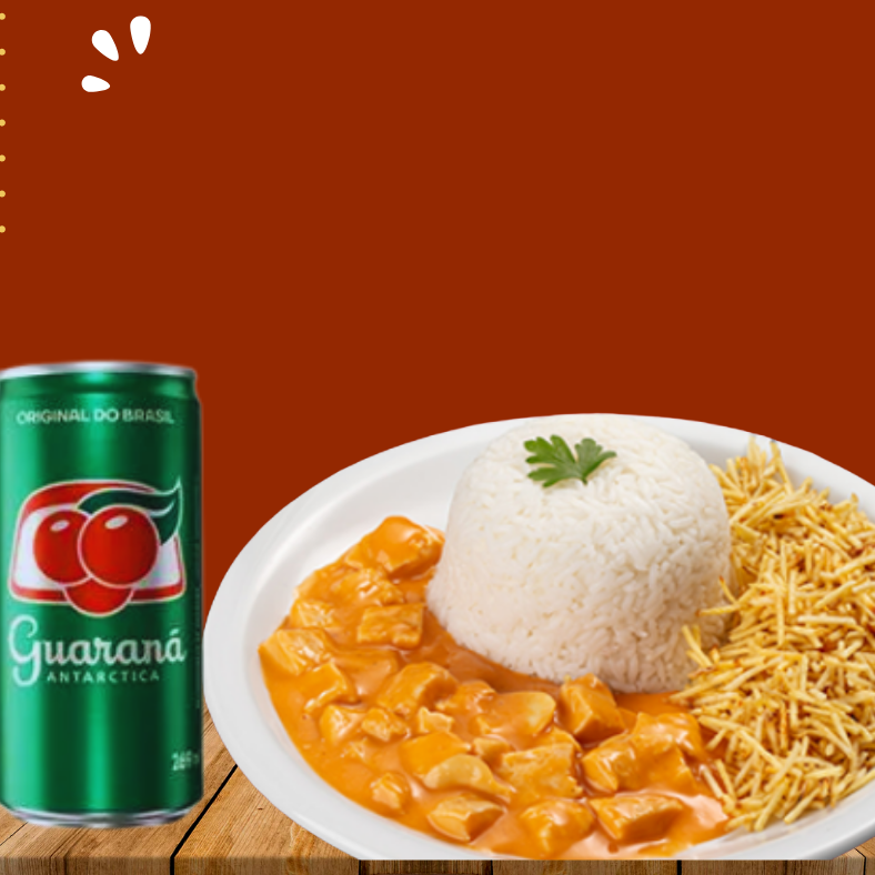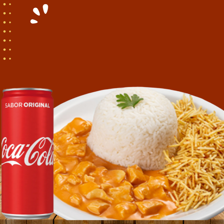 Que tal uma refeição completa, de strogonoff de frango finalizado com requeijão e ketchup. Acompanha arroz, batata palha, pudim e uma coca de 310 ml