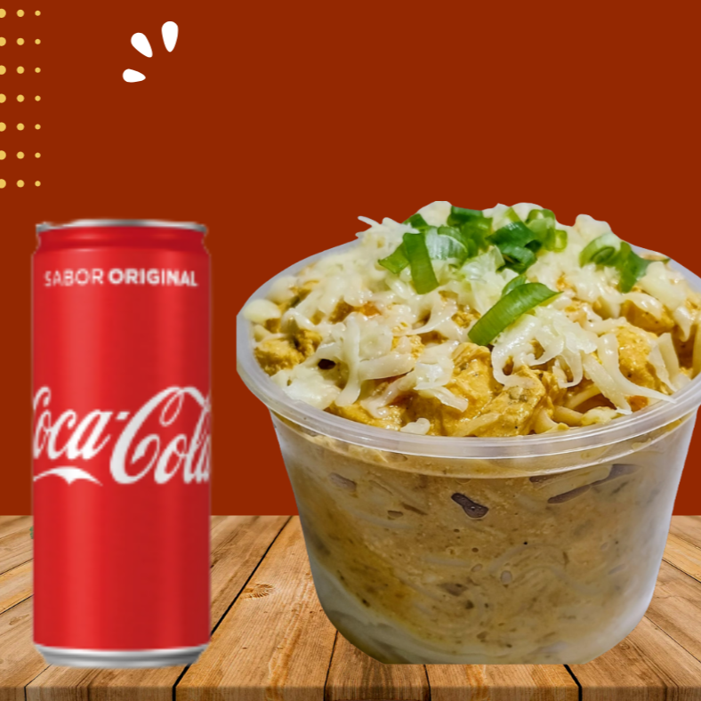 um delicioso macarrão com strogonoff de frango finalizado com requeijão + Coca cola lata