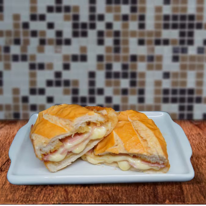 Pão francês, com presunto e queijo mussarela derretido na chapa.