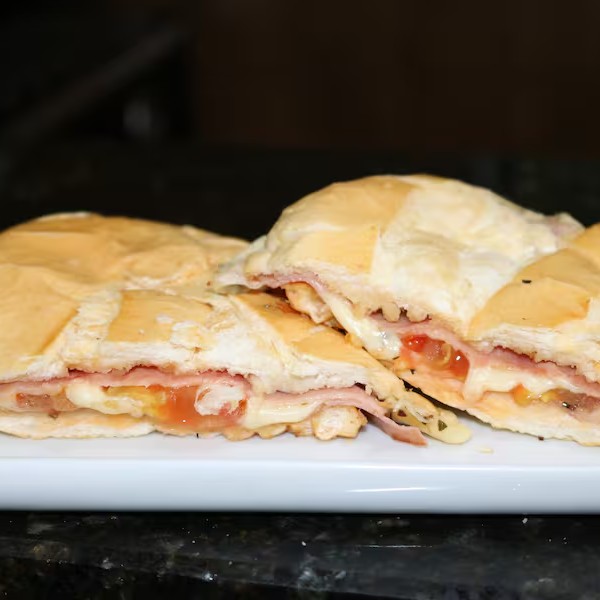 Pão francês, presunto, queijo, orégano, tomate