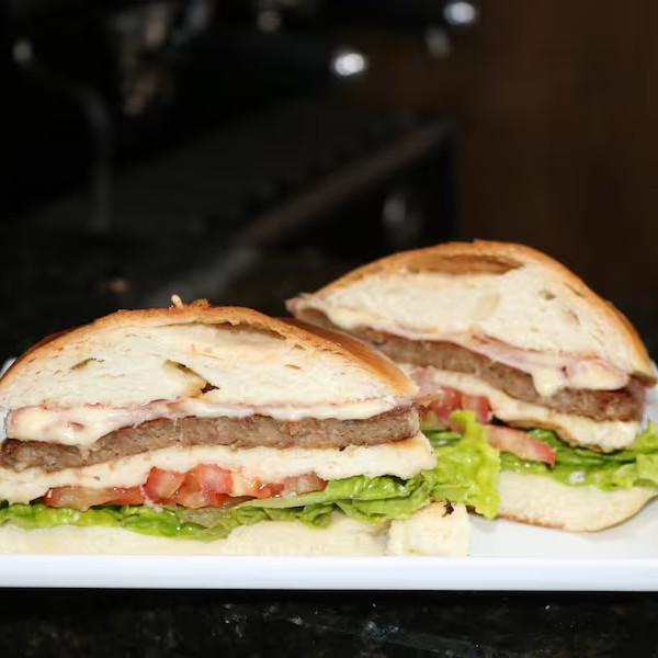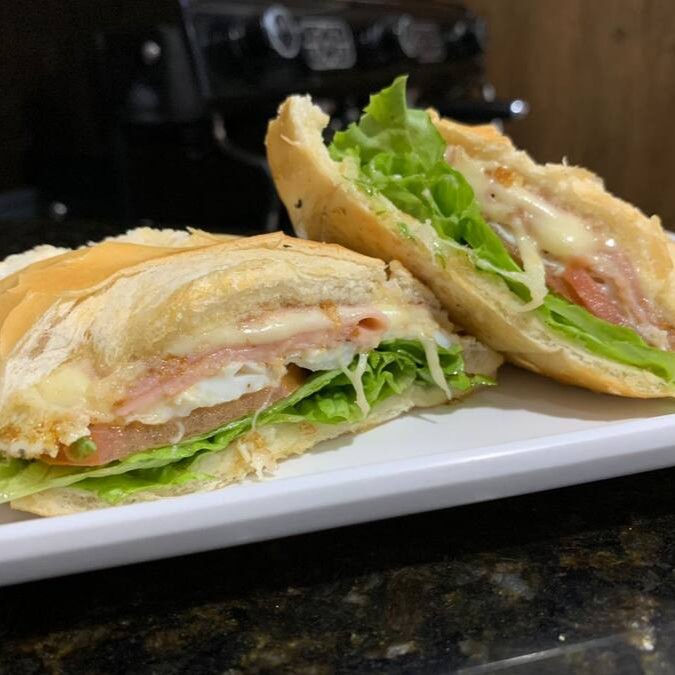 Pão de hamburguer, hamburguer, ovo, presunto, queijo, tomate e alface)