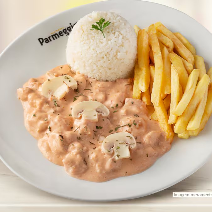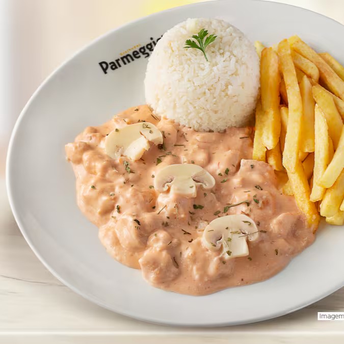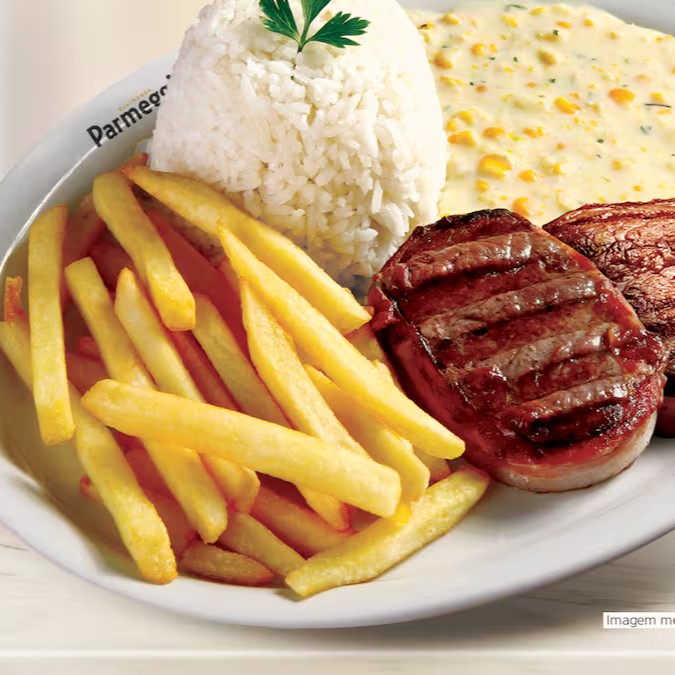 Acompanha arroz quentinho, batata frita crocante e uma deliciosa e exclusiva parmeggiana de mignon (130g).