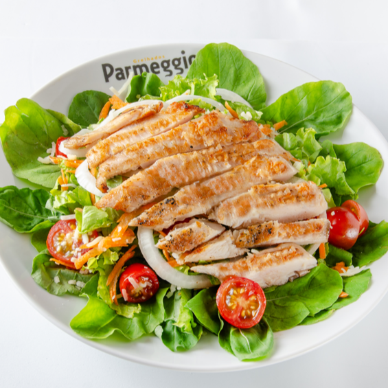Acompanha salada de rúcula, alface, tomate cereja, cenoura ralada, cebola em rodelas, parmesão e isca de frango (120g).