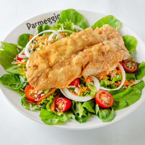 Acompanha salada de rúcula, alface, tomate cereja, cenoura ralada, cebola em rodelas, parmesão e filé de peixe - tilápia (120g).