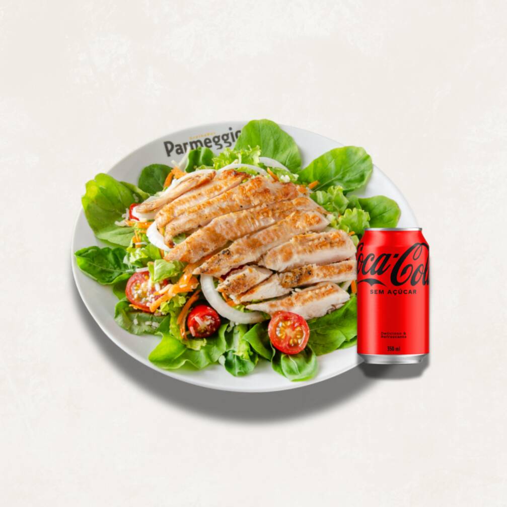 Acompanha rúcula, alface, tomate cereja, cenoura ralada, cebola em rodela, parmesão, isca de frango (120g) e coca-cola zero 350ml (lata).