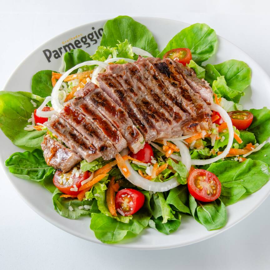 Acompanha salada de rúcula, alface, tomate cereja, cenoura ralada, cebola em rodelas, parmesão e isca de carne (140g).