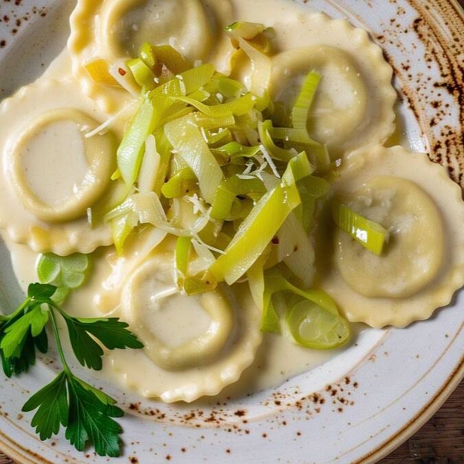 Desfrute da combinação perfeita de sabores e texturas em nosso Ravioli de Brie com Alho Poró Artesanal. Nossos raviolis são feitos à mão com amor e cuidado, recheados com um delicioso brie cremoso.