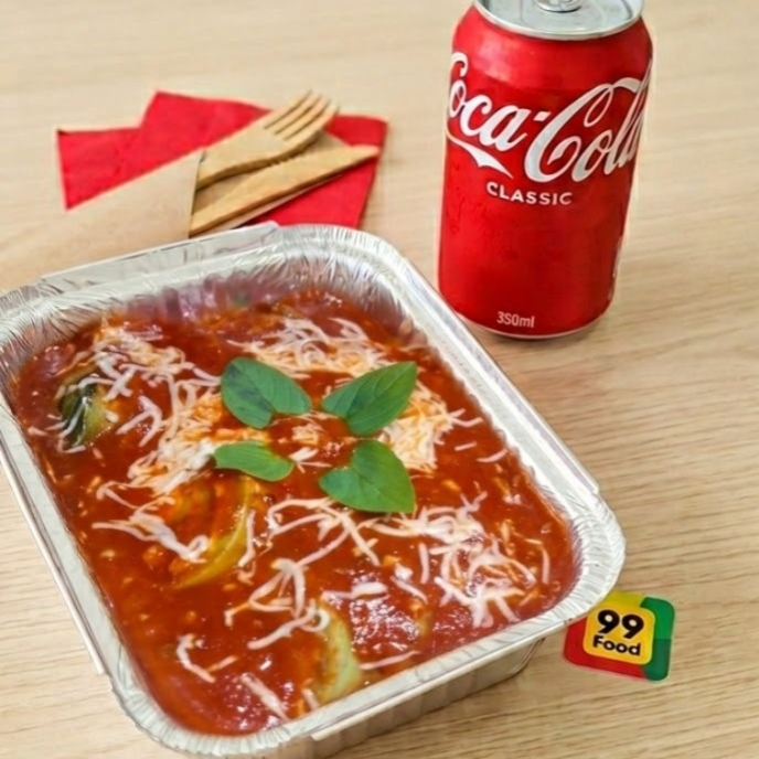 Coberto com molho pomodoro e gratinado com queijo.