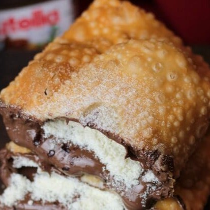 Massa de pastel caseira, sequinha e cremosa, recheada com delicioso creme de avelã. Pastel 17cm.