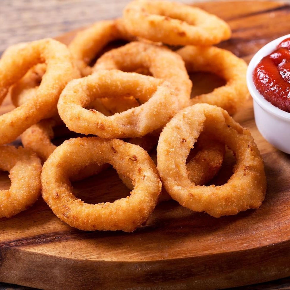 Fatias de cebola empanadas e fritas ! Porção grande saborosa e crocante ! Média 300g por porção.