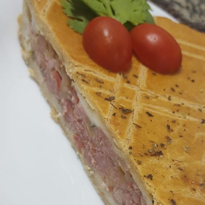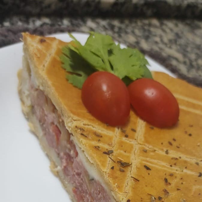 Fantástico e bem servido em média 200g de uma torta de frango divina: Feita com massa artesanal ao forno, peito de frango desfiado refogado, molho de tomate, tomate picado, ervilha, azeitona, cenoura, temperado a moda da chef e requeijão