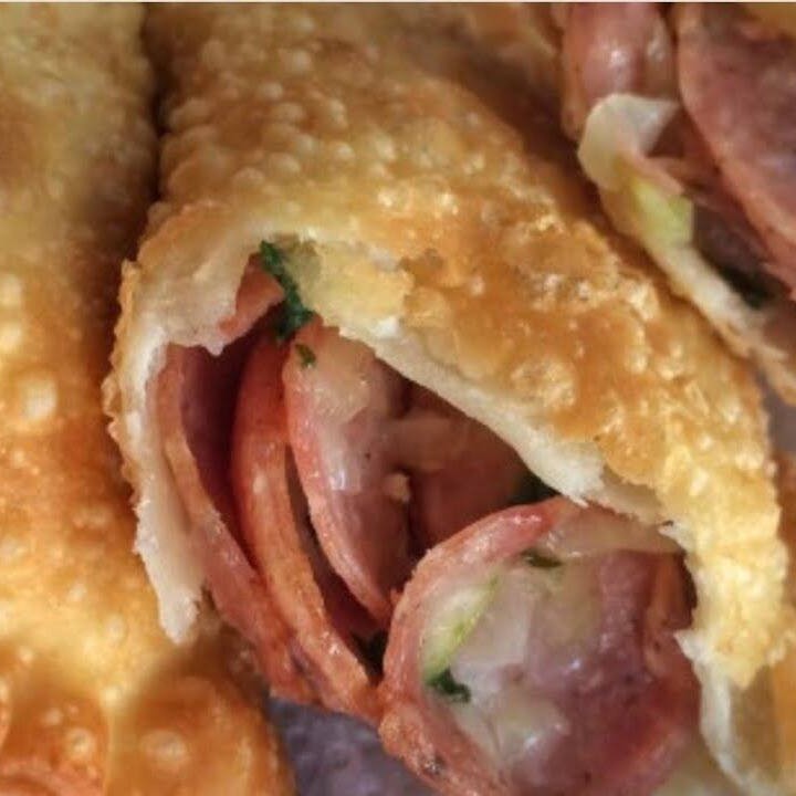 Massa de Pastel caseira, sequinha e cremosa, recheada com calabresa fatiada, + Recheio Adicional À Sua Escolha temperado a moda da casa. Pastel de 22cm.