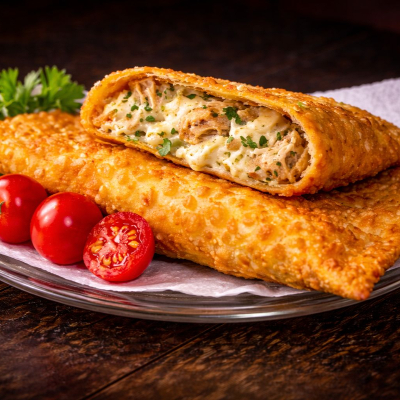 Massa crocante e dourada, recheada com frango desfiado bem temperado e suculento, combinado com requeijão cremoso que derrete na boca e deixa cada mordida ainda mais irresistíve