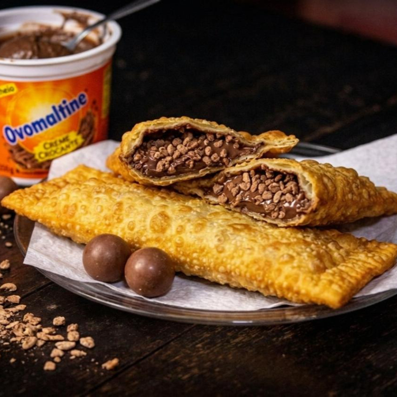 Massa crocante e dourada, recheada com creme de Ovomaltine que derrete e entrega aquele sabor marcante de chocolate com toque crocante irresistível. Doce na medida certa, perfeito para quem ama uma sobremesa diferente e cheia de sabor.