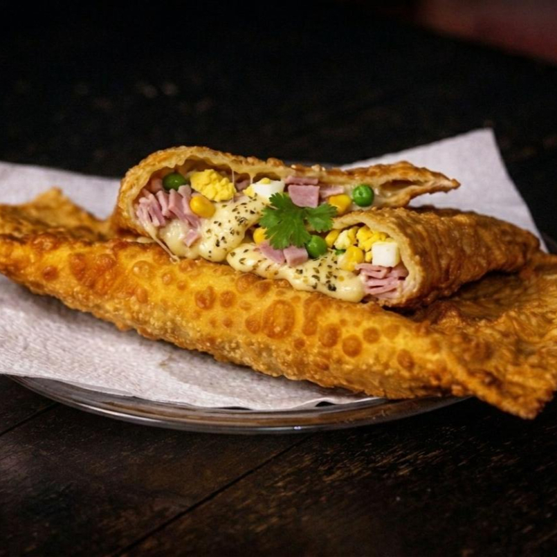 Massa crocante e dourada, recheada com uma combinação irresistível de presunto, queijo, ovos, cebola, tomate e azeitonas, tudo bem temperado para trazer o verdadeiro sabor da tradicional portuguesa. Feito na hora, quentinho e bem recheado, perfeito para quem busca um pastel completo e cheio de sabor.