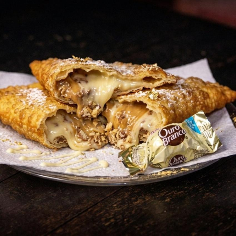 Massa crocante e dourada, recheada com pedaços generosos de chocolate Ouro Branco, que derrete e se mistura ao recheio, trazendo uma combinação irresistível de chocolate ao leite com toque cremoso e crocante. Uma opção doce perfeita para fechar com chave de ouro, feita na hora e servida quentinha, garantindo uma experiência deliciosa a cada mordida.