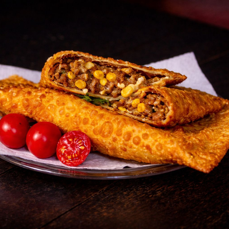 Massa sequinha e crocante por fora, recheada com carne moída bem temperada e suculenta, combinada com milho doce que traz um contraste perfeito de sabor e textura. Cada mordida é equilibrada, saborosa e simplesmente irresistível. Feito na hora, quentinho e dourado, ideal pra matar a fome com muito prazer. Experimente e se surpreenda! 💛