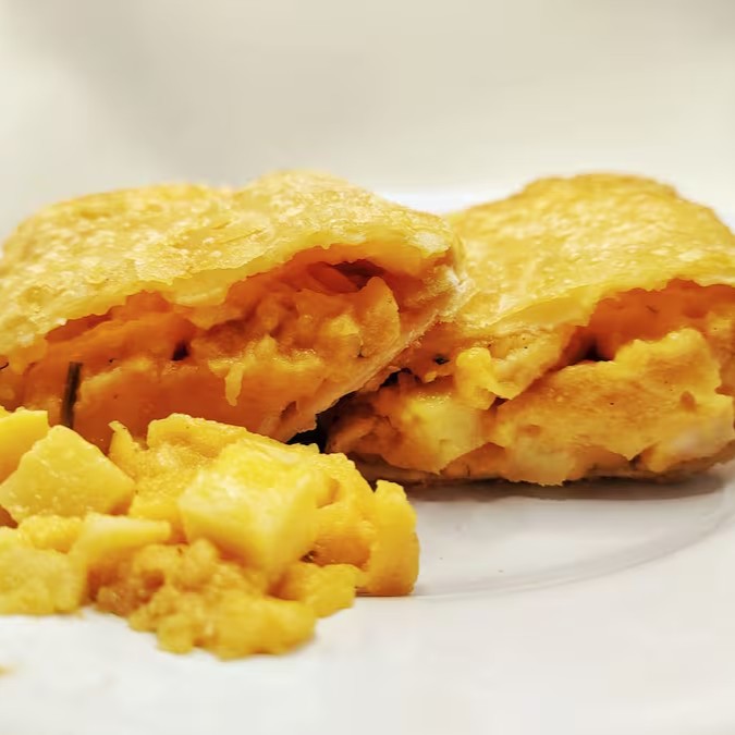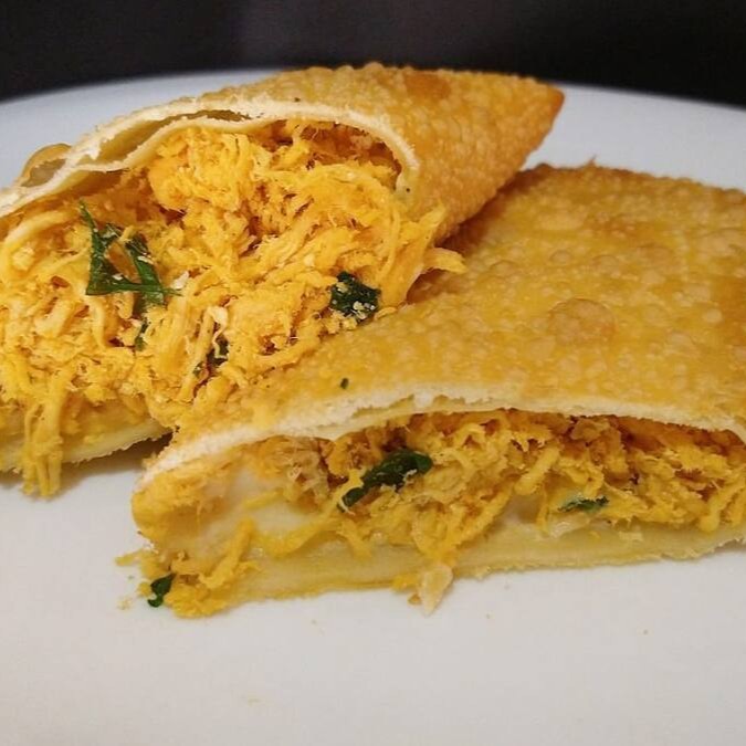 Opções de pastéis de frango desfiado e delicioso. Tamanho padrão dos pastéis: 20 centímetros.