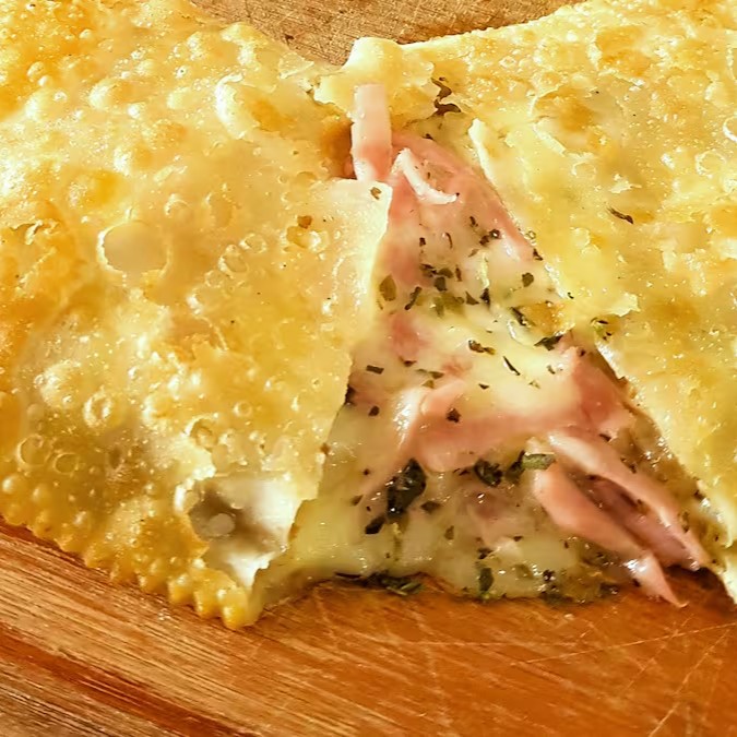 Delioso pastel de pizza, feito com presunto, mussarela e um toque de oregano, cremoso e muito suculento envolto de uma massa crocante e sequinha (Tamanho 20 cm / não adicionamos / não retiramos ingredientes / pastéis prontos)