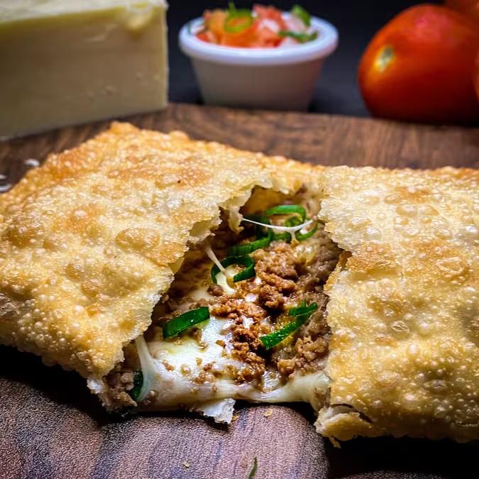 Deliciosa carne moida soltinha e bem temperada com cebolinha e mussarela derretida, massa dourada, crocante e sequinha, tamanho 20cm e aproximadamente 60g de recheio***não adicionamos e nem retiramos ingredientes "pastéis prontos"***