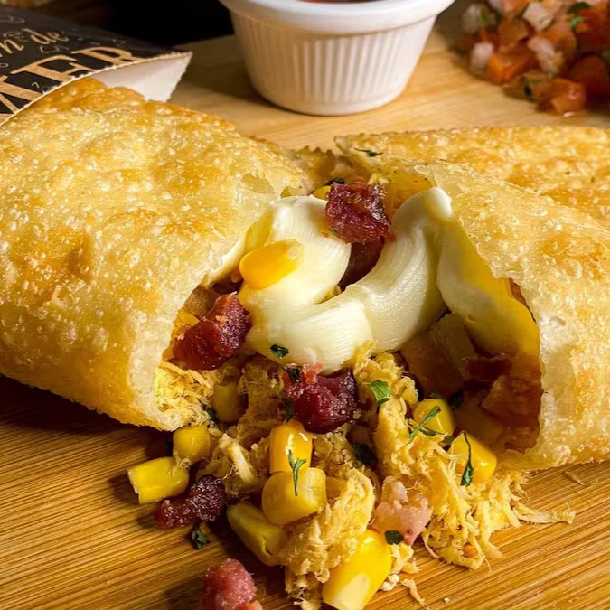 Frango soltinho e bem temperadinho, acrescentado de Catupiry dando cremosidade, o milho?! Crocância perfeita, e o bacon?! suculência surreal, uma explosão de sabores e sensações em um unico pastel, fazendo de cada mordida a proxima ser a melhor!!! Recheio do começo ao fim!!! tamanho 20cm aproximadamente 125g de recheio***não adicionamos e nem retiramos ingredientes "pastéis prontos"***