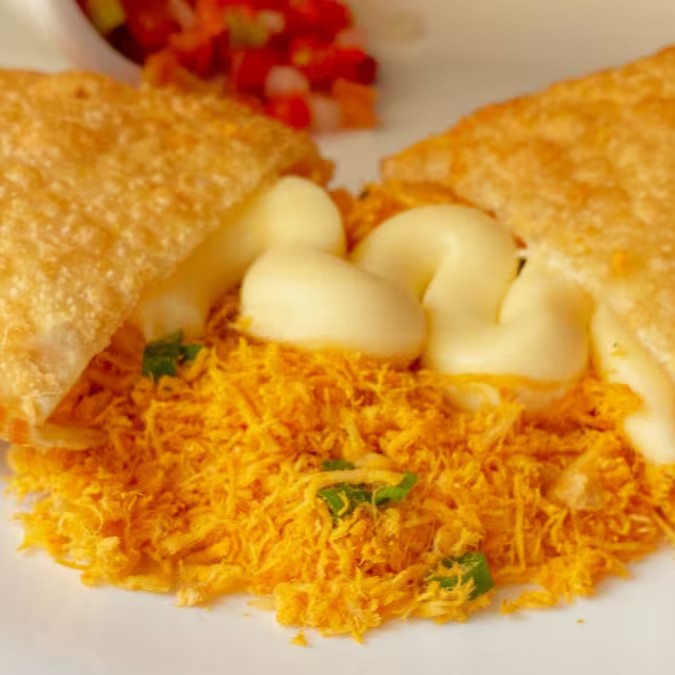 Pastel feito com sassami desfiado e catupiry, massa dourada, crocante e sequinha, tamanho 20cm com aproximadamente 65g de recheio