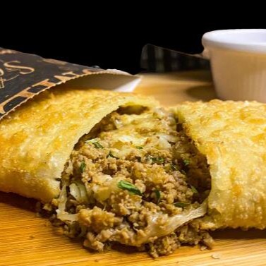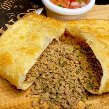 Pastel feito com carne moida acem bem temperadinha , massa dourada, crocante e sequinha, tamanho 20cm com aproximadamente 50g de recheio