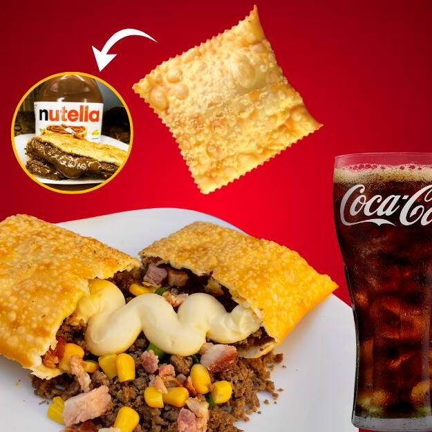 Combo Pastel Touro Bandido: Carne, Catupiry, milho e bacon + Pastel Doce De Nutella + Coca Cola Lata 350ml