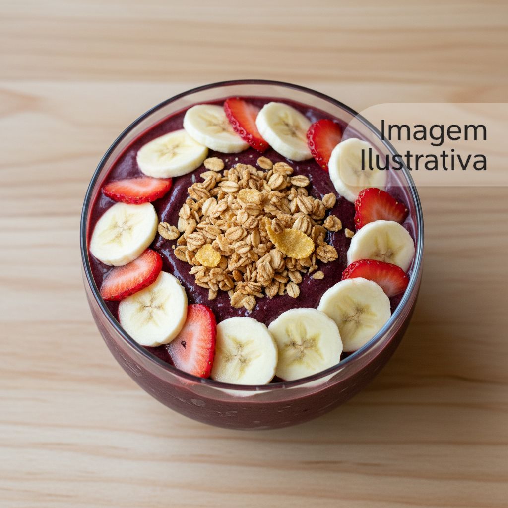 Açaí cremoso servido com bananas fatiadas, morangos e um toque de granola.