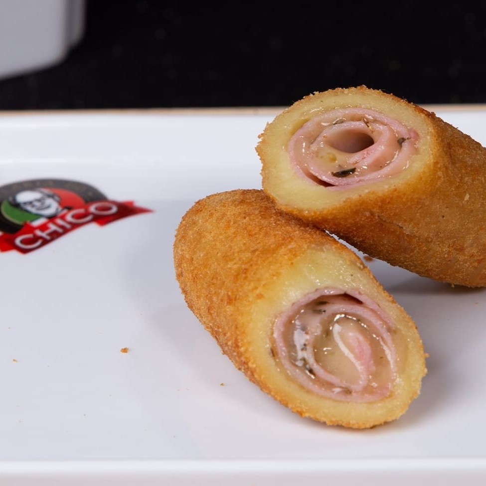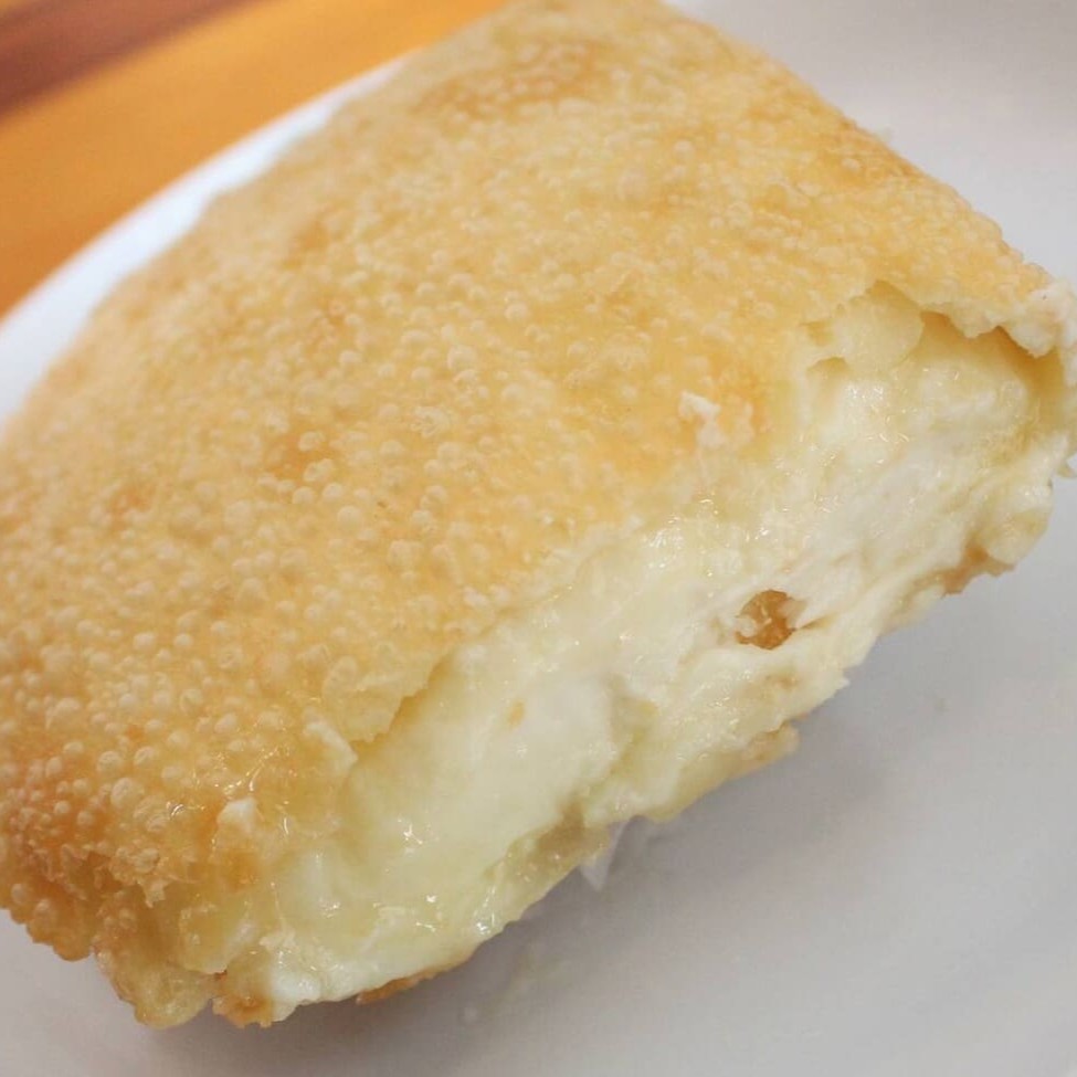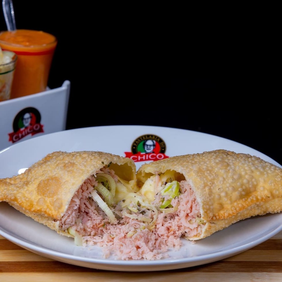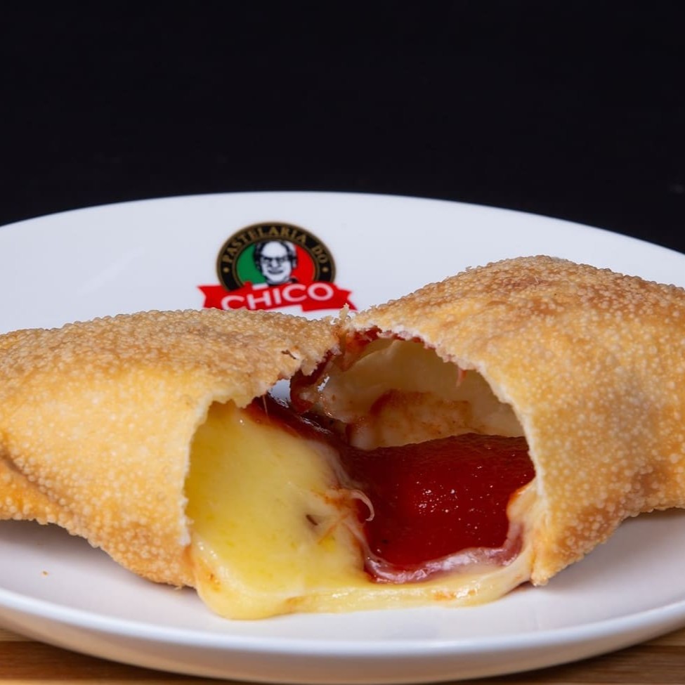 Salgado frito a base de trigo recheado com presunto e queijo mussarela