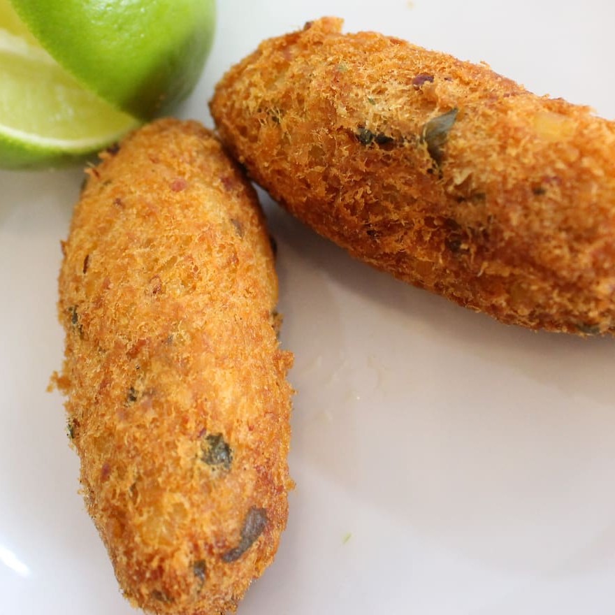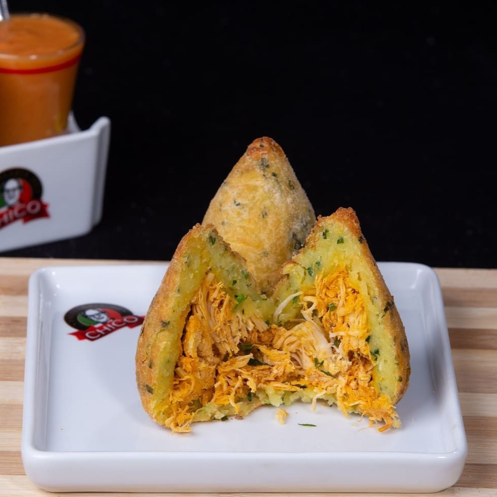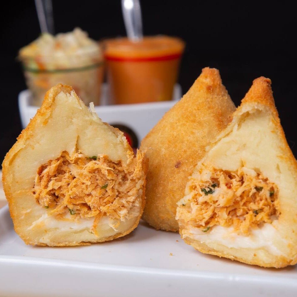 Coxinha massa de mandioca recheada com frango desfiado e salsinha