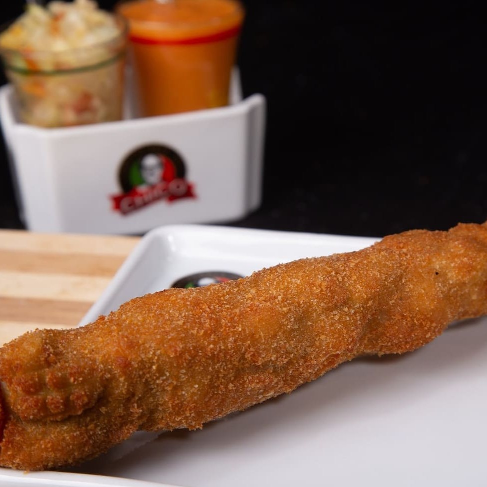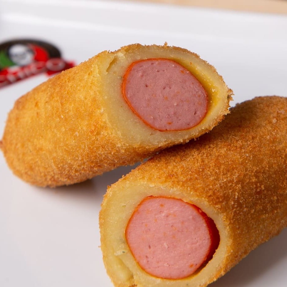 Salgado frito a base de trigo recheado com uma salsicha completa