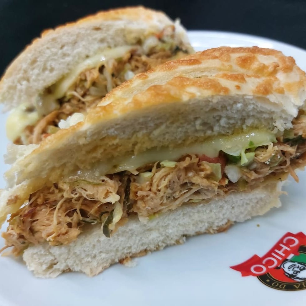 Baguete com queijo, pernil desfiado, mussarela e vinagrete.