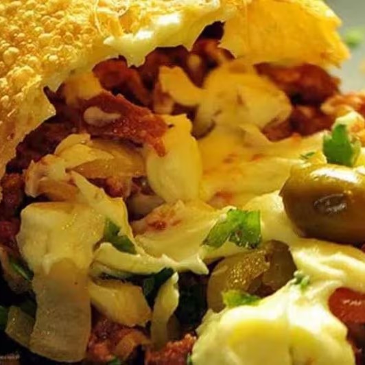 Nosso pastel mais completo! Recheado com carne moída temperada, frango desfiado, mussarela derretida, Catupiry cremoso, palmito macio, azeitonas e milho doce. Frito na hora com massa crocante e muito recheio. É grande, é saboroso, é X-Tudão!