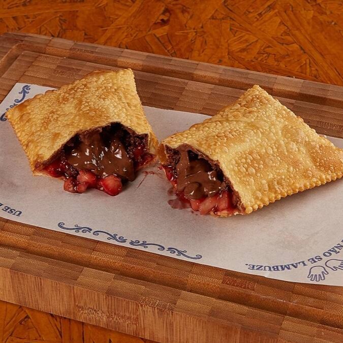 Pastel doce frito na hora, com massa crocante e recheado com morango e chocolate derretido. Uma combinação clássica, irresistível e cheia de sabor, perfeita pra quem ama uma sobremesa com equilíbrio entre o doce e o frutado!