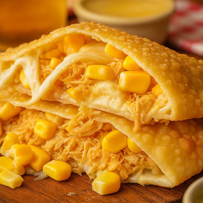 Pastel crocante, recheado com frango desfiado bem temperado e milho doce na medida certa. Frito na hora com massa sequinha e leve. Simples, saboroso e sempre uma ótima escolha!