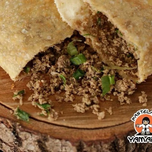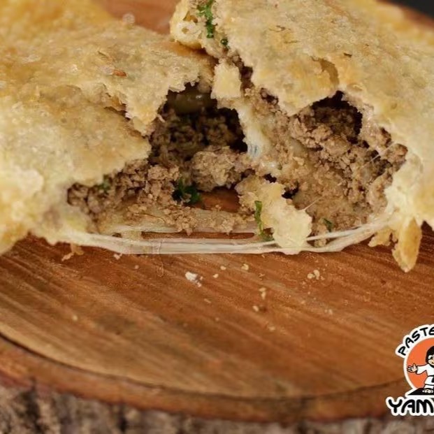 Carne moída refogada com cebola e alho, salsinha, cebolinha, chimichurri e mussarela. Contém 1 azeitona.