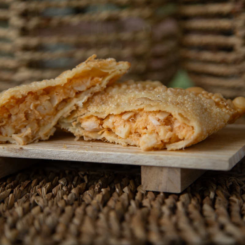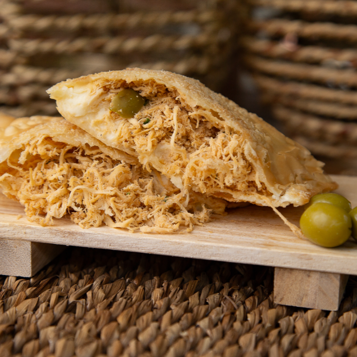 Delicie-se com nosso Pastel de Frango Supremo com Requeijão, um dos pastéis mais desejados do . Massa premium de produção artesanal que proporciona uma textura incomparável. O recheio é composto por peito de frango desfiado, refogado com iguarias naturais A salsinha, cebolinha e azeitonas adicionam um toque verde e vibrante e o requeijão cremoso garante a cremosidade que equilibra perfeitamente todos os sabores.