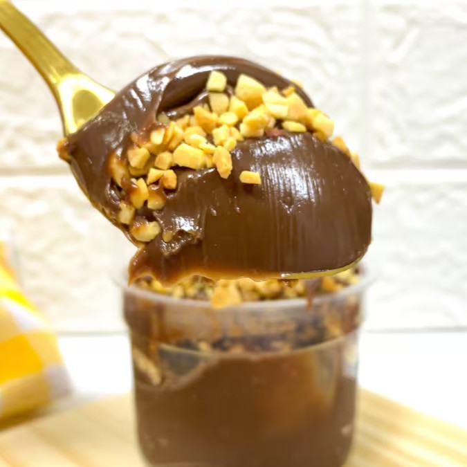 Brigadeiro de colher com nosso recheio extra cremoso feito com chocolate 50% cacau, amendoim triturado e Nutella Original purinha. Pote 140ml.