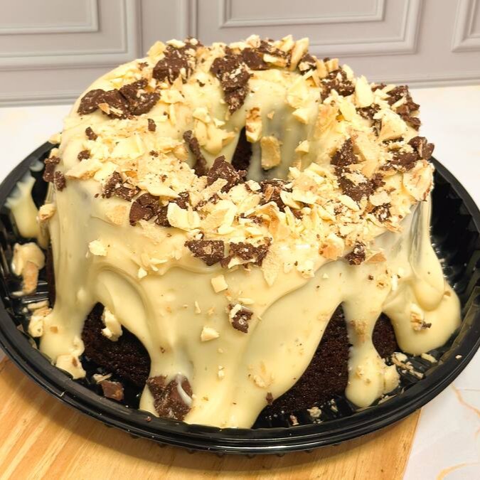 Composta por bombons Ouro Branco picados, delicioso recheio cremoso de leite em pó e recheio de chocolate 50% cacau bem cremoso e brilhante. Pedaços do nosso brownie bem molhadinho e chocolatudo. Finalizado com granulado de chocolate nobre e mais bombons para decorar.