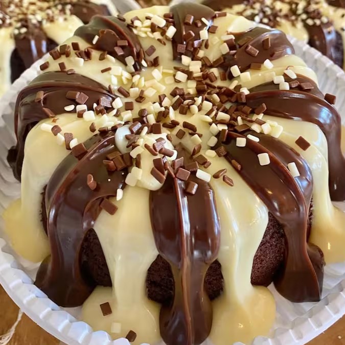 Bolo vulcão na massa de chocolate super fofinha que derrete na boca. Recheio de brigadeiro branco super cremoso e brigadeiro de chocolate 50%, a combinação perfeita que tudo mundo ama!