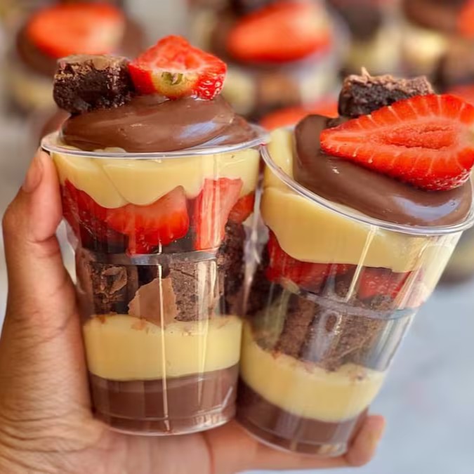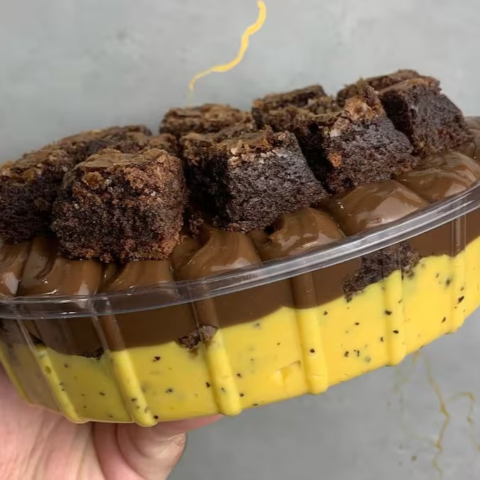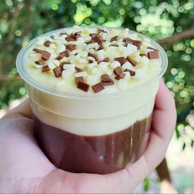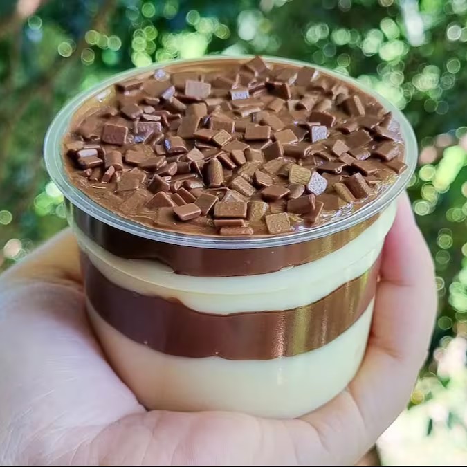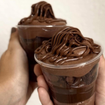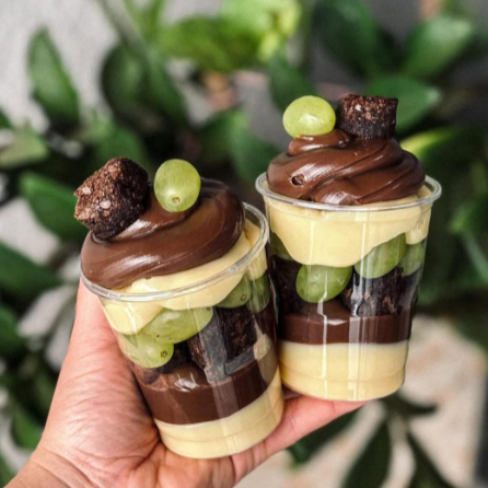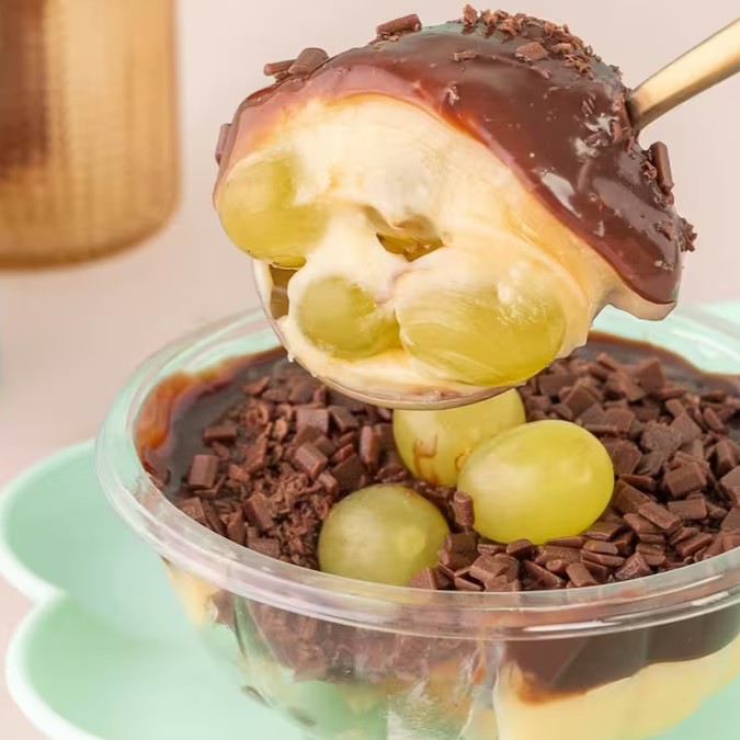 Delicioso copo composto por brigadeiro cremoso de Ninho e brigadeiro 50% cacau, pedaços do nosso melhor brownie chocolatudo, uvas verdes sem sementes picadas. Copo 200ml