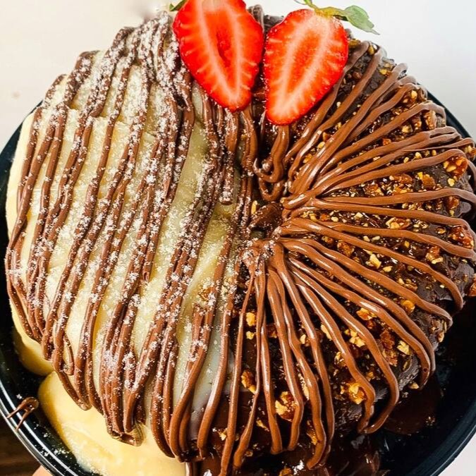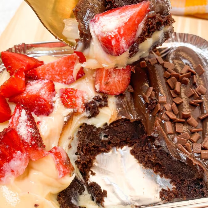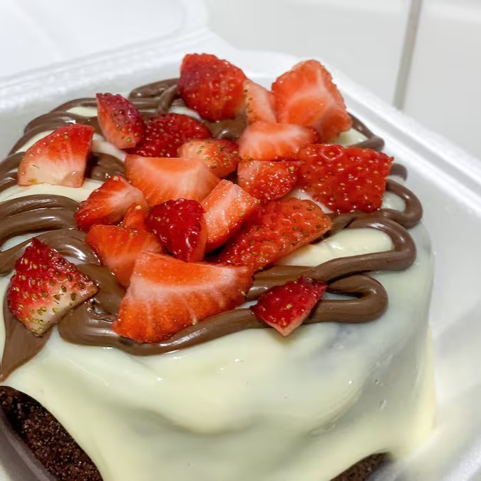 Delicioso brownie bem chocolatudo e molhadinho, recheado com brigadeiro de Ninho e brigadeiro 50% cacau ambos cremosos e saborosos. Finalizado com morangos frescos picados e granulado de chocolate nobre.